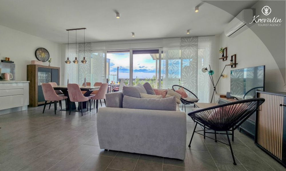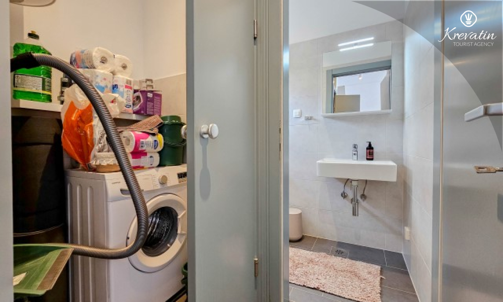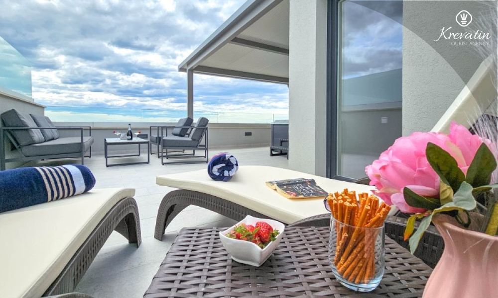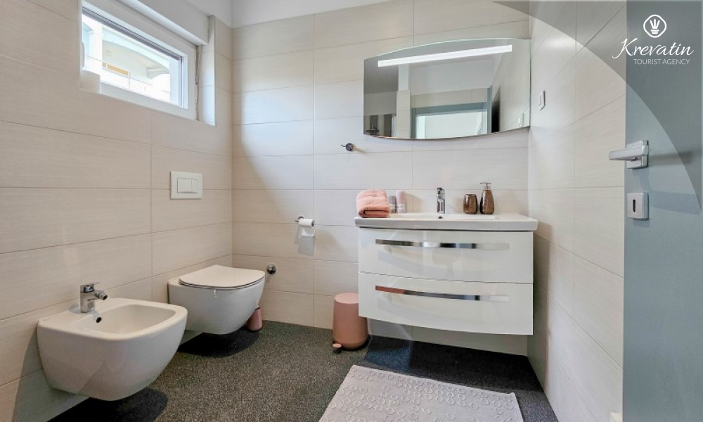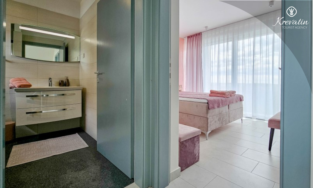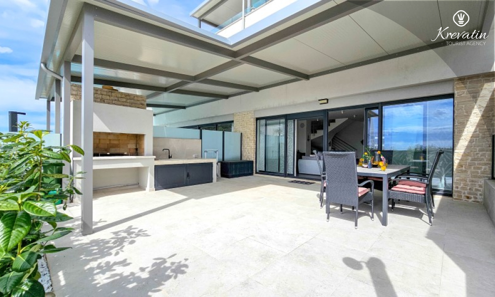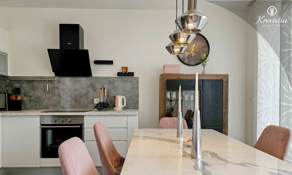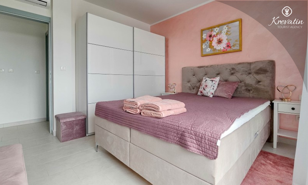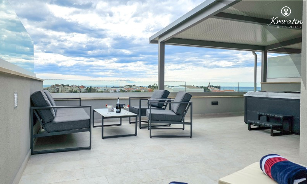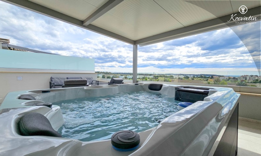 U prizemlju se nalazi prostrani dnevni boravak povezan s blagovaonicom i kuhinjom – opremljenom svim osnovnim stvarima za pripremu obroka, te kupaonica s tušem i WC-om. Na katu su dvije spavaće soba s bračnim krevetima i balkonom, te dodatna kupaonica, a dodatne dvije osobe mogu udobno spavati u dnevnom boravku. Na krovnoj terasi se nalazi jacuzzi i vrtni namještaj, a u prizemlju se nalazi prostrana terasa za opuštanje i roštilj.