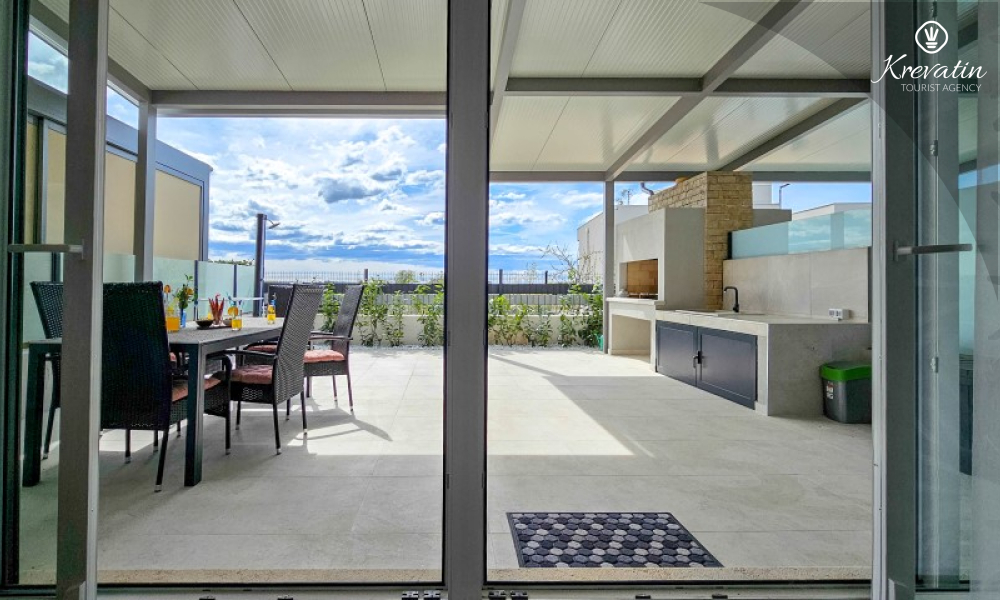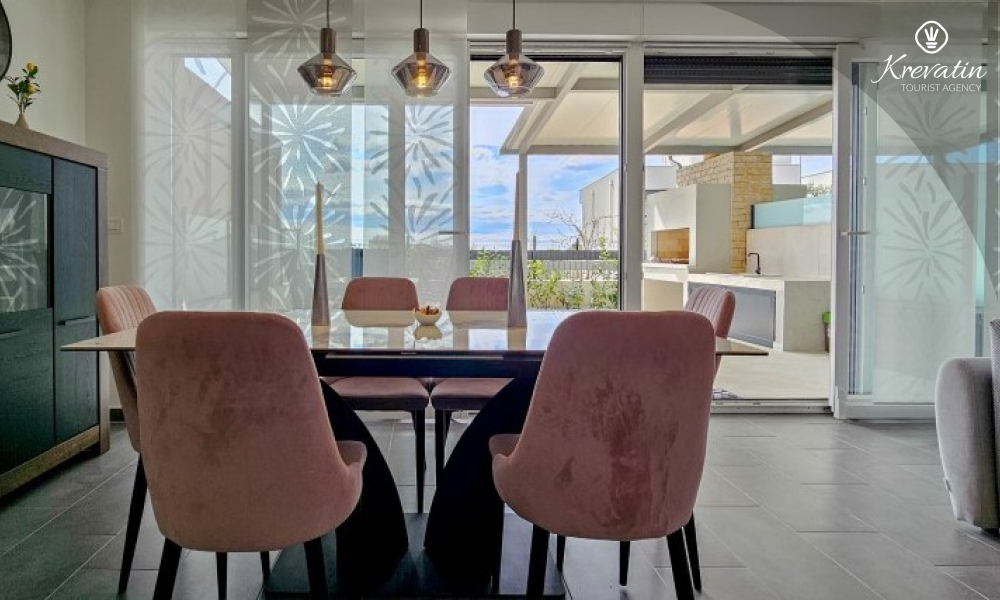 Ova moderna kuća u nizu na tri etaže nalazi se u mirnom dijelu Novigrada – dovoljno blizu centra i mora, i idealna je za 4 do 6 osoba.