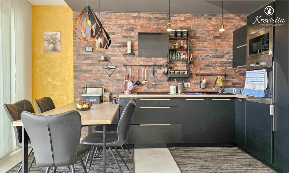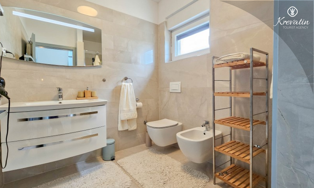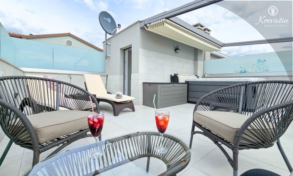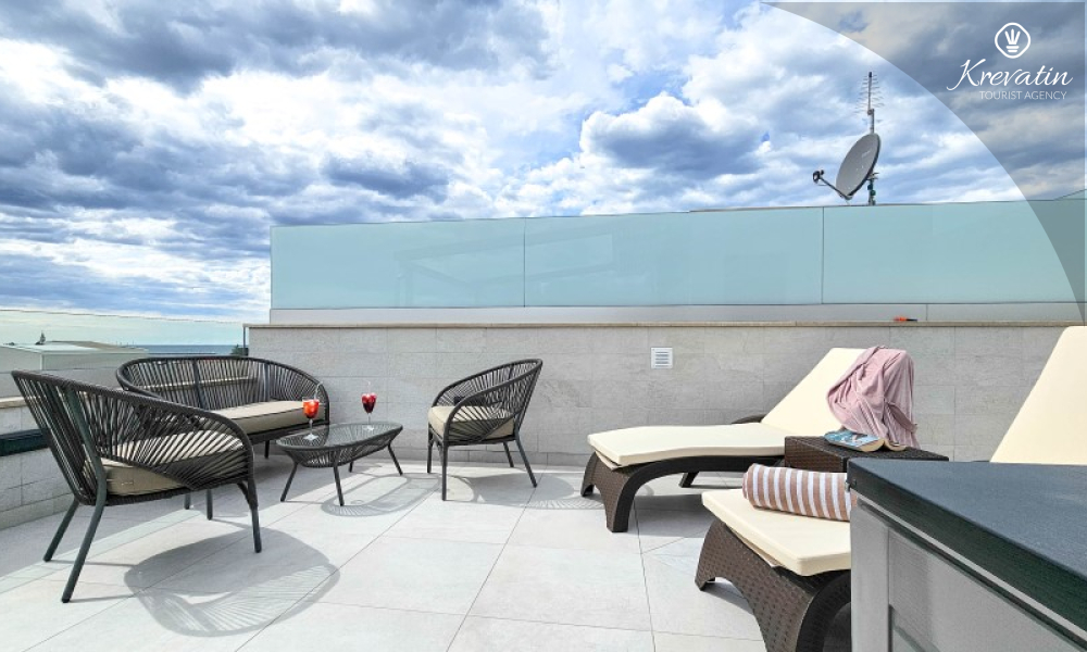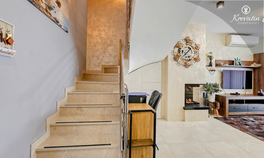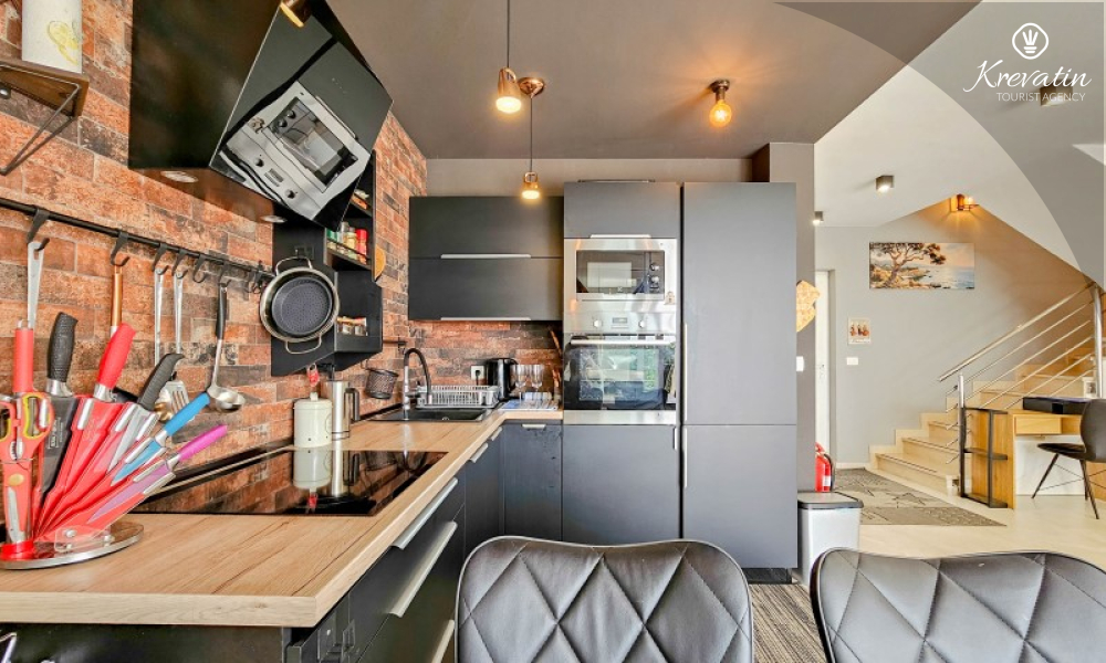 U prizemlju se nalazi prostrani dnevni boravak povezan s blagovaonicom i kuhinjom – opremljenom svim osnovnim stvarima za pripremu obroka, te kupaonica s tušem i WC-om. Na katu su dvije spavaće soba s bračnim krevetima i balkonom, te dodatna kupaonica, a dodatne dvije osobe mogu udobno spavati u dnevnom boravku. Na krovnoj terasi se nalazi jacuzzi i vrtni namještaj, a u prizemlju se nalazi prostrana terasa za opuštanje i roštilj.