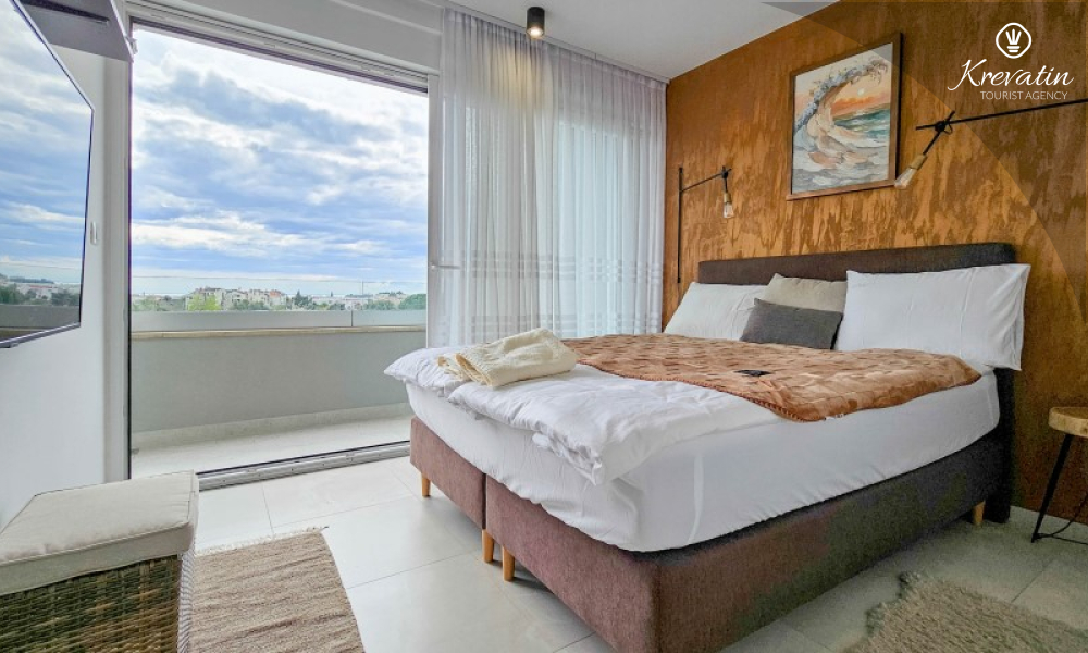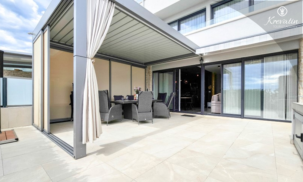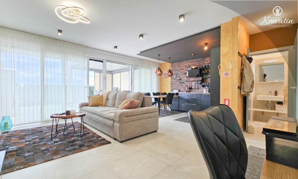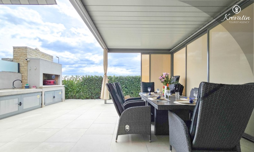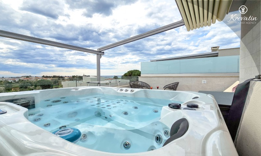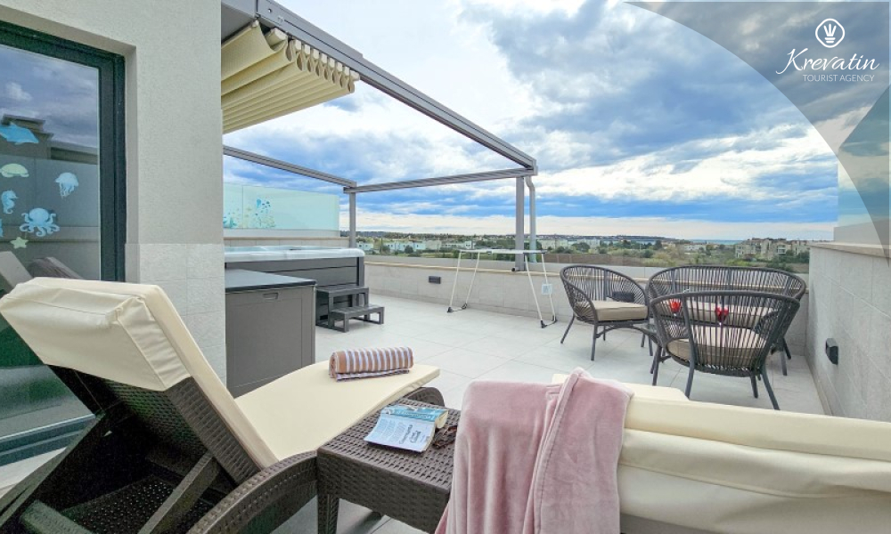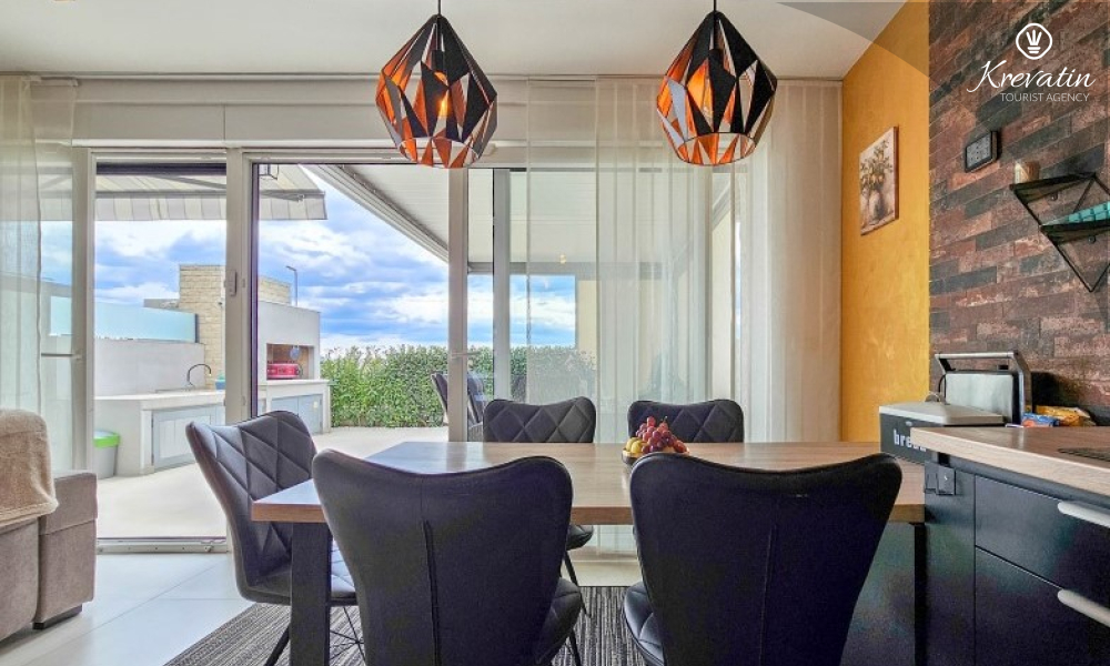 U prizemlju se nalazi prostrani dnevni boravak povezan s blagovaonicom i kuhinjom – opremljenom svim osnovnim stvarima za pripremu obroka, te kupaonica s tušem i WC-om. Na katu su dvije spavaće soba s bračnim krevetima i balkonom, te dodatna kupaonica, a dodatne dvije osobe mogu udobno spavati u dnevnom boravku. Na krovnoj terasi se nalazi jacuzzi i vrtni namještaj, a u prizemlju se nalazi prostrana terasa za opuštanje i roštilj.