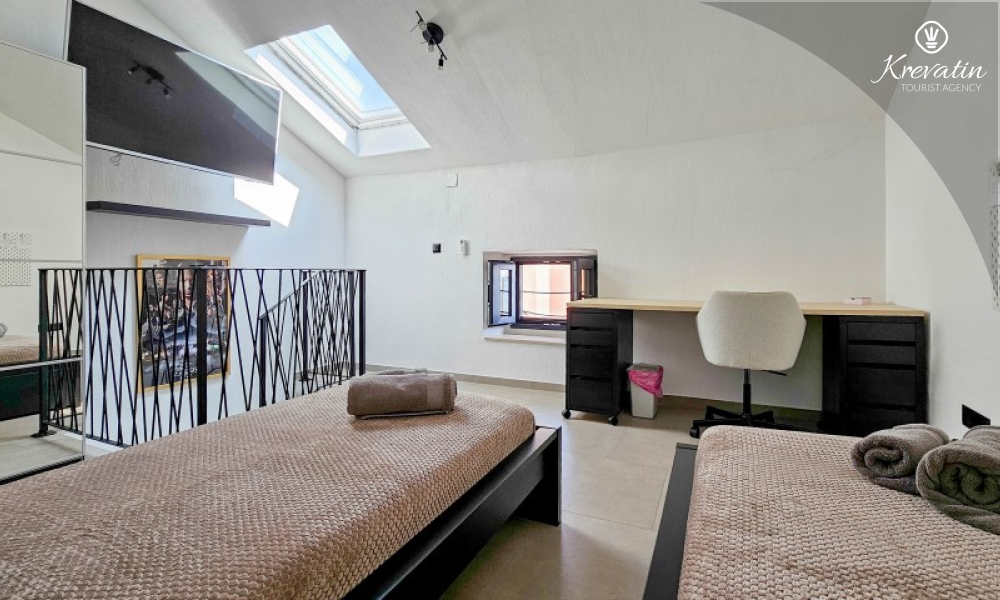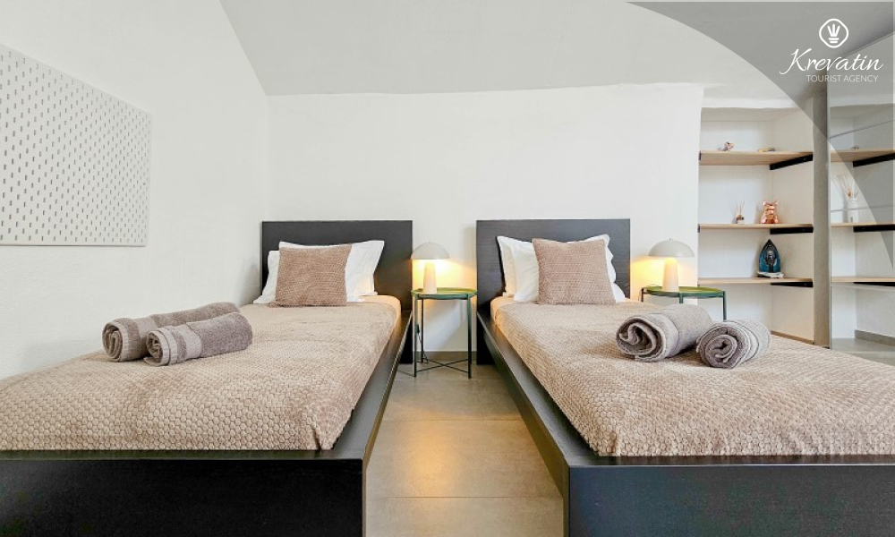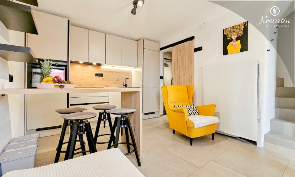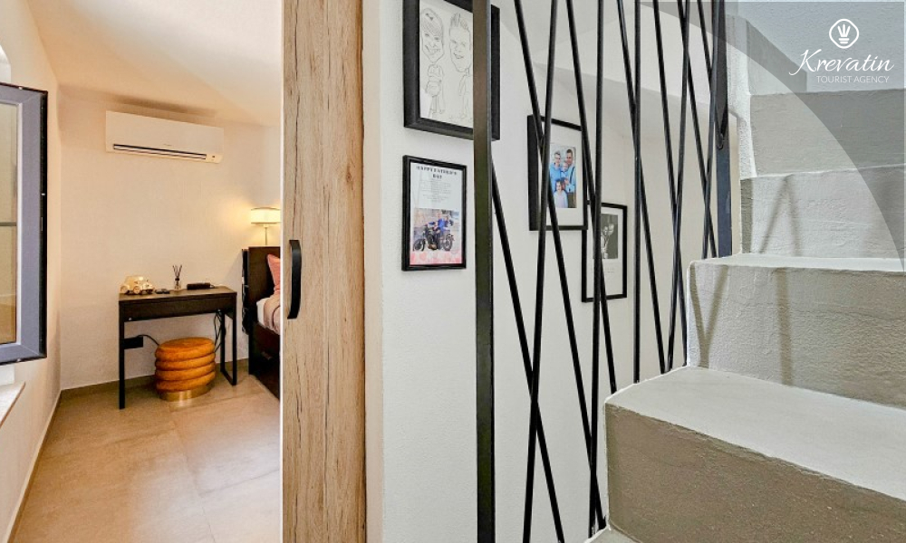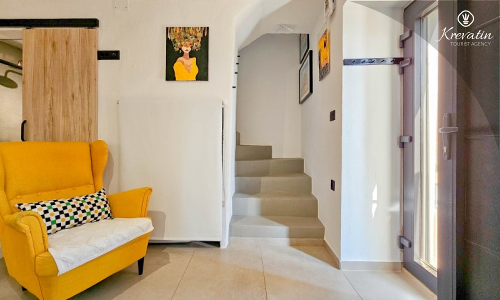 U prizemlju se nalazi ugodan dnevni boravak povezan s kuhinjom i blagovaonicom, opremljenom svim osnovnim sadržajima za pripremu obroka, te kupaonica s tušem i WC-om. Na prvom katu smještena je spavaća soba s bračnim krevetom i vlastitom kupaonicom, dok se na drugom katu nalazi druga spavaća soba s dva odvojena kreveta. Ispred kuće, na raspolaganju je terasa koja pruža ugodan prostor za opuštanje, bilo uz jutarnju kavu ili večernju čašu vina.