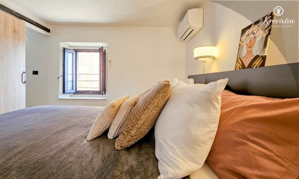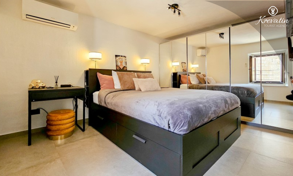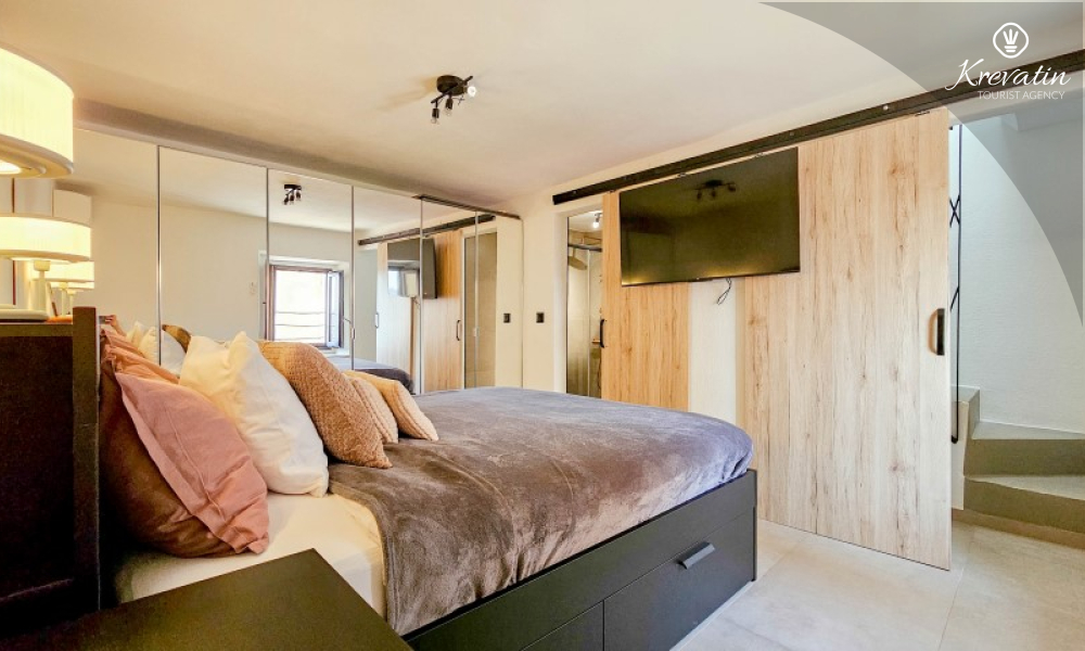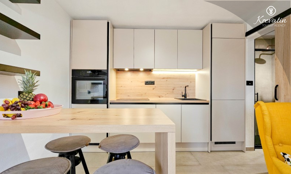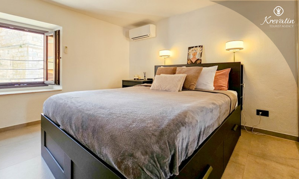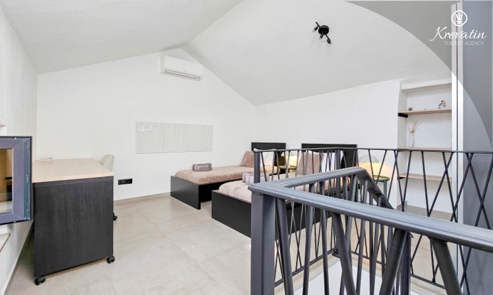 U prizemlju se nalazi ugodan dnevni boravak povezan s kuhinjom i blagovaonicom, opremljenom svim osnovnim sadržajima za pripremu obroka, te kupaonica s tušem i WC-om. Na prvom katu smještena je spavaća soba s bračnim krevetom i vlastitom kupaonicom, dok se na drugom katu nalazi druga spavaća soba s dva odvojena kreveta. Ispred kuće, na raspolaganju je terasa koja pruža ugodan prostor za opuštanje, bilo uz jutarnju kavu ili večernju čašu vina.