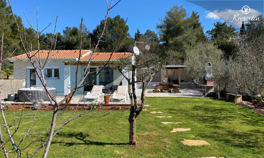 Kuća se nalazi u prizemlju i sastoji se od dvije udobne spavaće sobe, komfornog dnevnog boravka i potpuno opremljene kuhinje. Kuhinja je opremljena električnim štednjakom, perilicom posuđa, pećnicom, hladnjakom i aparatom za kavu, pružajući vam sve što vam je potrebno za pripremu ukusnih obroka. Uz to, kuća ima i modernu kupaonicu s tušem i WC-om, te prekrasnu terasu opremljenu namještajem za opuštanje i uživanje na otvorenom. Prostrani vrt s roštiljem i jacuzzijem pruža dodatnu raznolikost i mogućnost za uživanje u opuštanju i druženju.