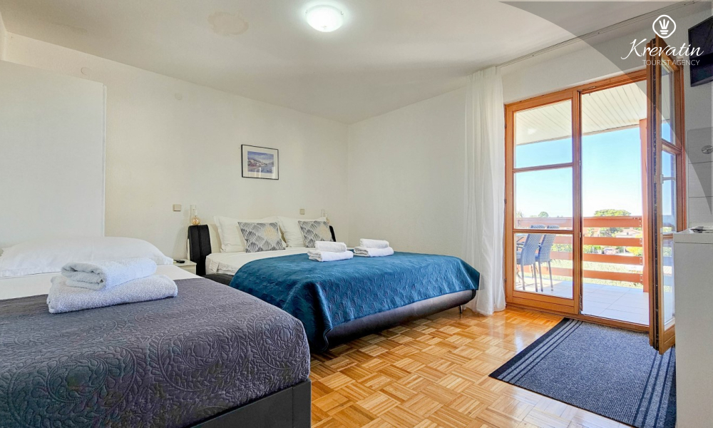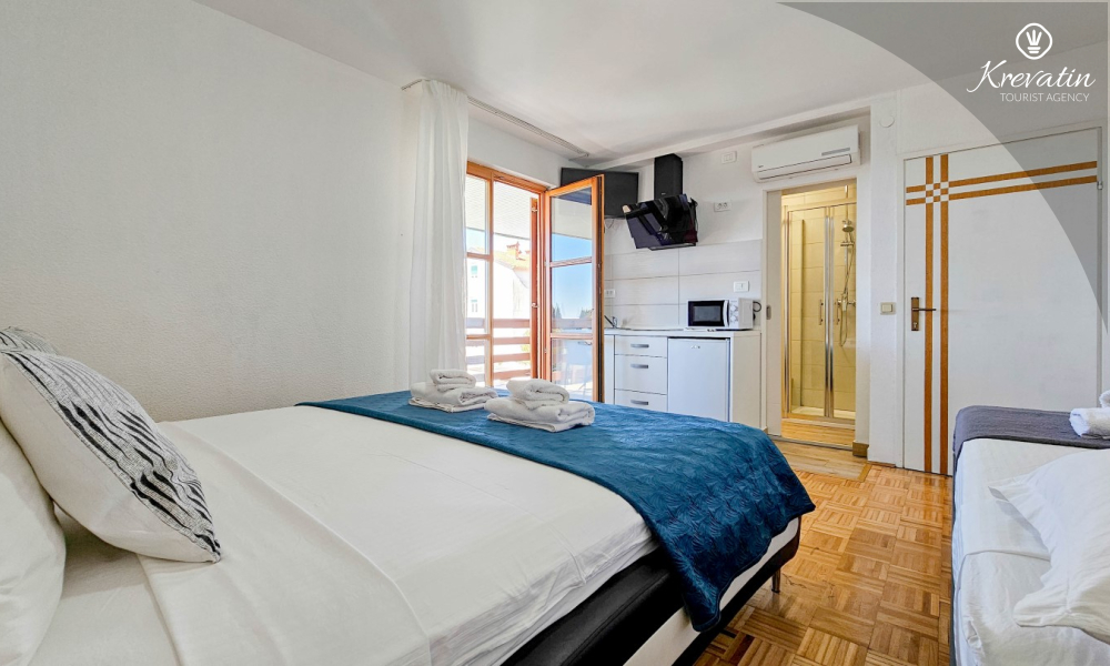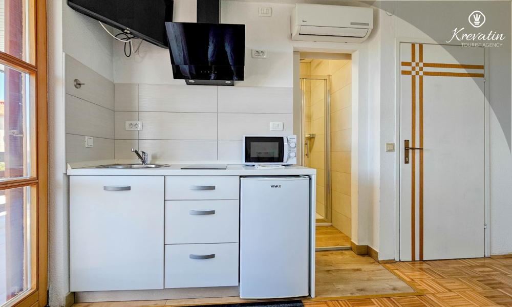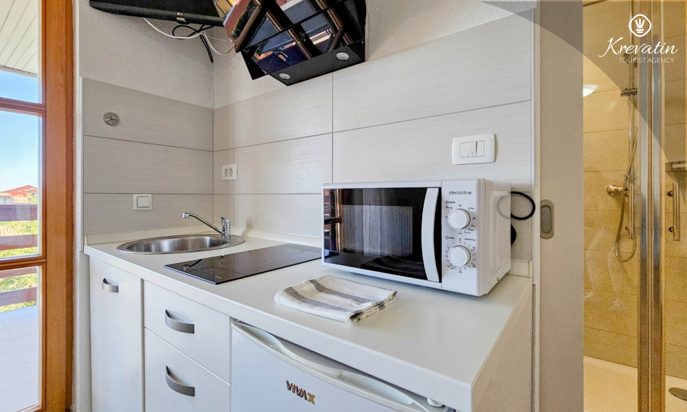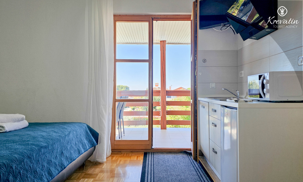 Prostor je organiziran otvoreno: bračni krevet, dodatni krevet za treću osobu i mala kuhinja s osnovnom opremom za pripremu jednostavnih obroka. Kupaonica s tušem i WC-om nalazi se u sklopu jedinice. Na raspolaganju je i balkon, idealan za jutarnju kavu ili večernja druženja.