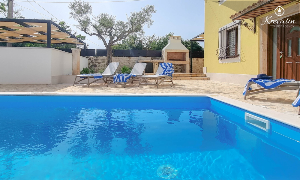Ova šarmantna istarska kuća za 6 osoba nudi udoban dnevni boravak, kuhinju s blagovaonicom, tri spavaće sobe i dvije kupaonice, idealna za obiteljski odmor ili druženje s prijateljima. U vrtu je na raspolaganju bazen s ležaljkama i tušem te natkrivena terasa s roštiljem - idealno za druženja.