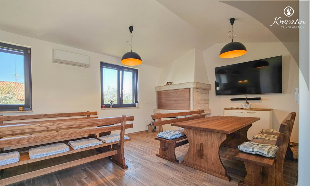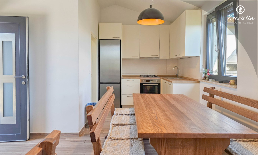 Ova kuća za odmor za 8 do 10 osoba, sastoji se od tri jedinice sve smještene u prizemlju. Prvo, tu je veliki apartman sa tri spavaće sobe i jednim kaučem na razvlačenje za dvije osobe, dva kupatila te dnevnog boravka s kuhinjom. Kuhinja je opremljena sa plinskim štednjakom, hladnjakom, perilicom posuđa i aparatom za kavu. Drugo, tu je studio apartman za dvije osobe sa bračnim krevetom, kupatilom i malom kuhinjom. I treće, tu je taverna sa opremljenom kuhinjom, velikim unutarnjim kaminom i kupatilom.
