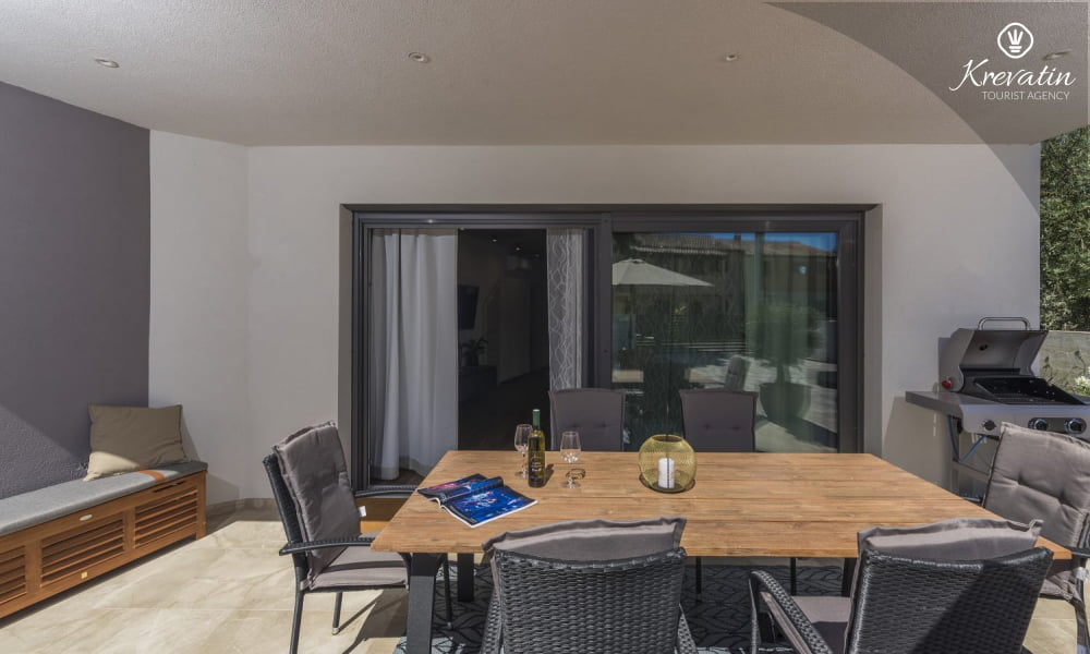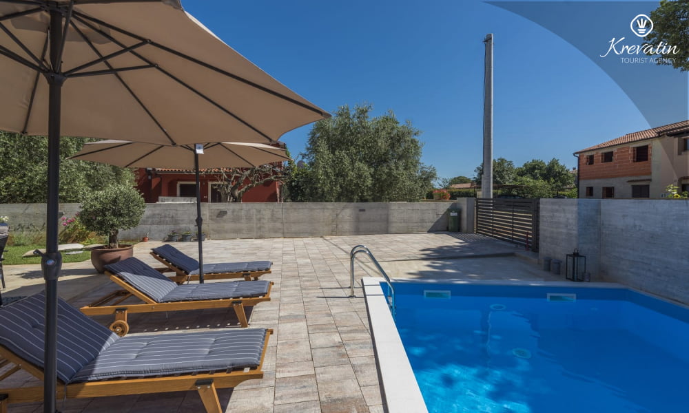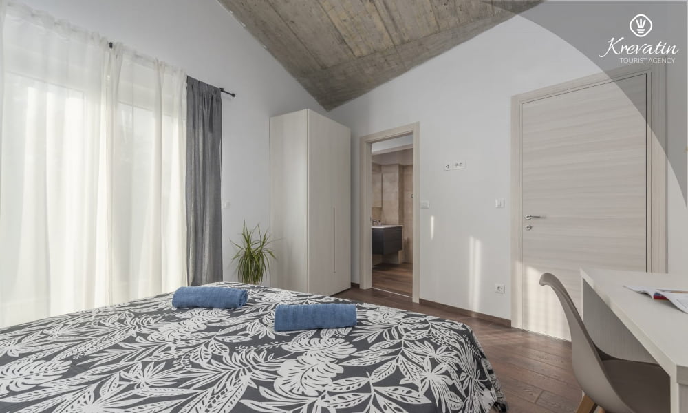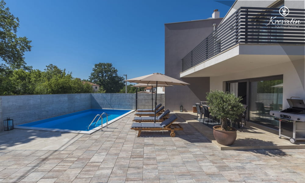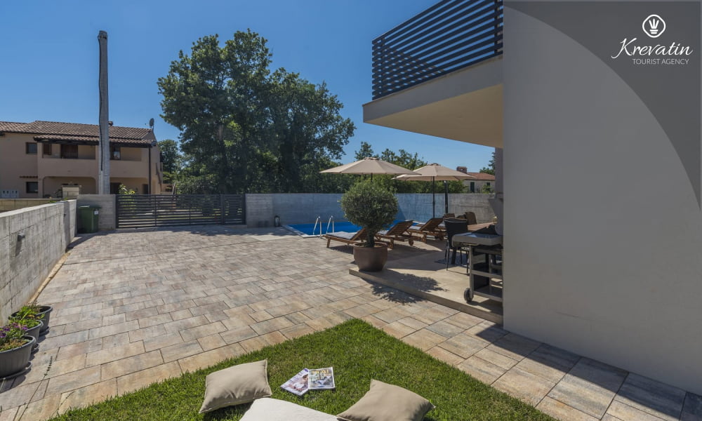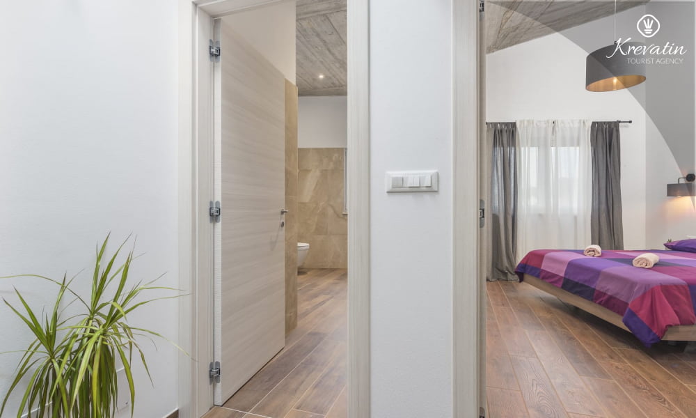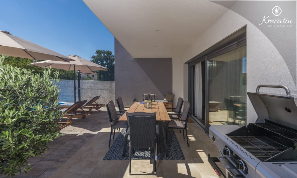 jedne spavaće sobe, druga ima tuš i wc. Treća kupaonica opremljena je samo s wc-om i nalazi se u prizemlju. Vila ima prostranu terasu s roštiljem, lijep vrt i privatni bazen. Privatni parking, SAT-TV, klima, perilica rublja, perilica posuđa, internet i bazen su uključeni u cijenu. Kućni ljubimci su dobrodošli uz nadoplatu.