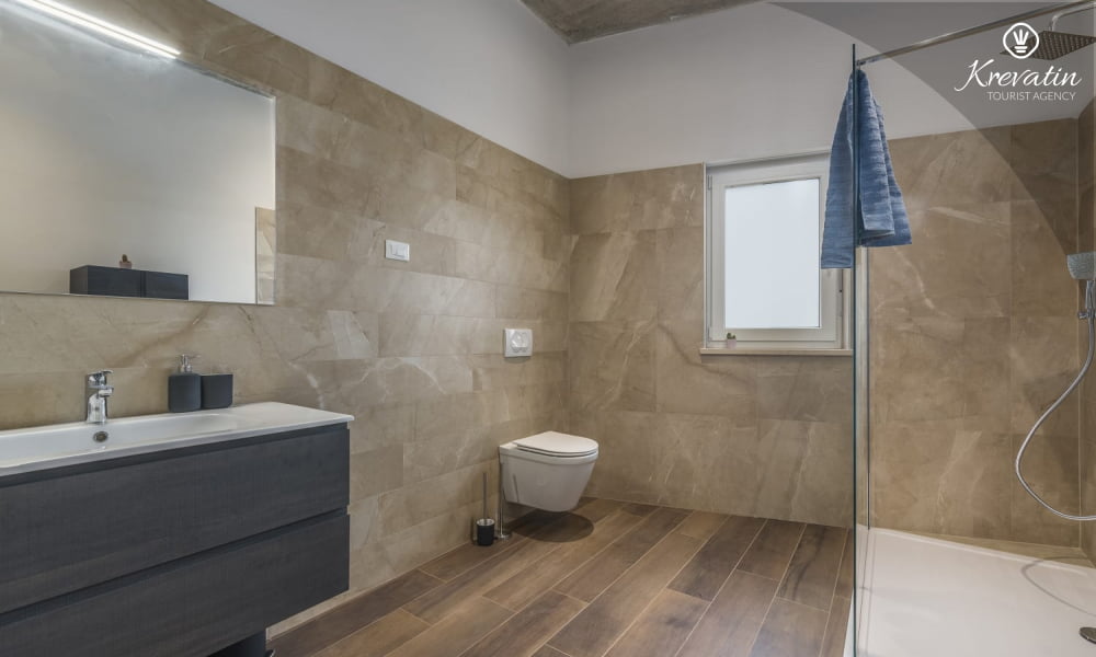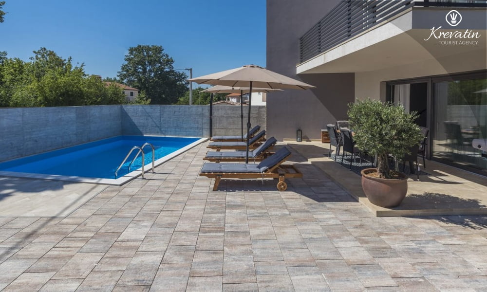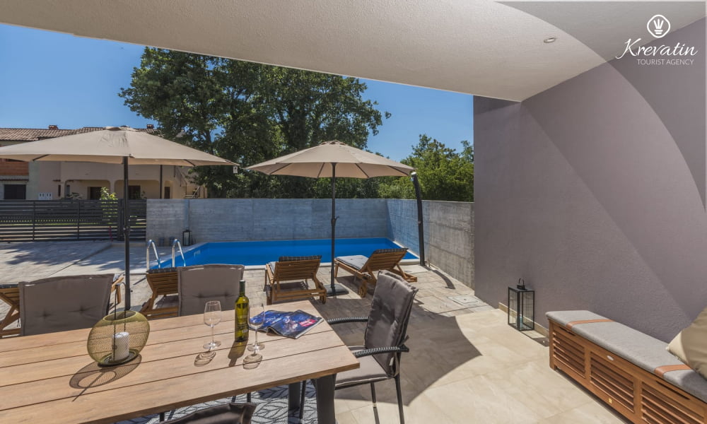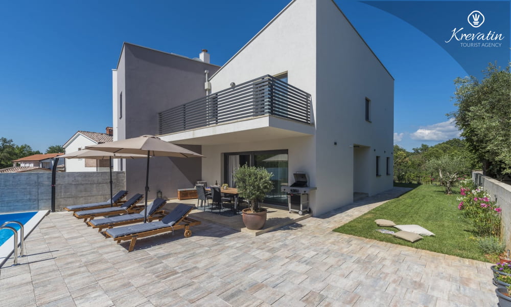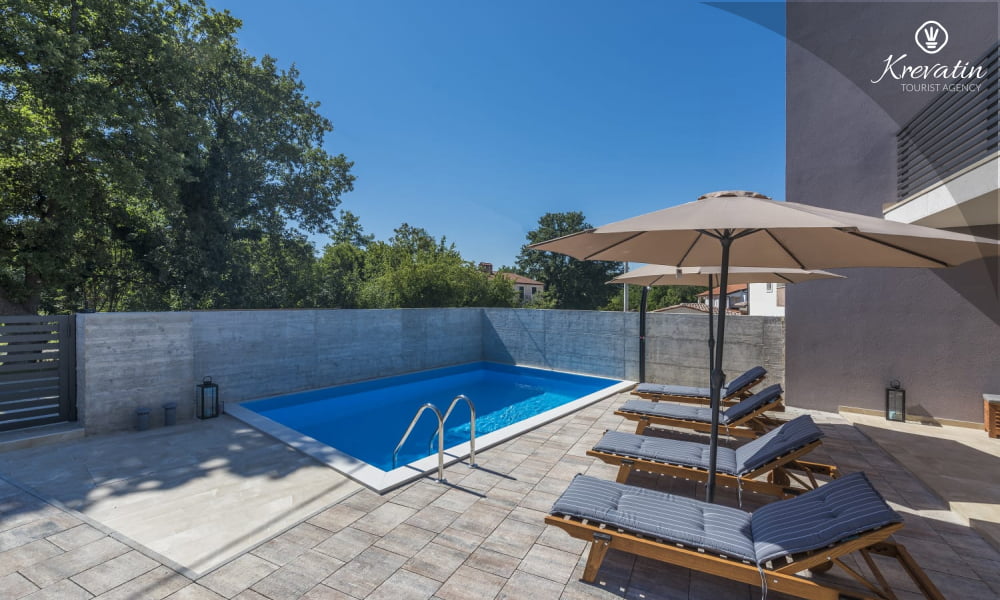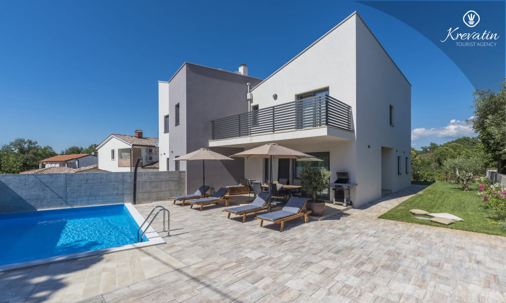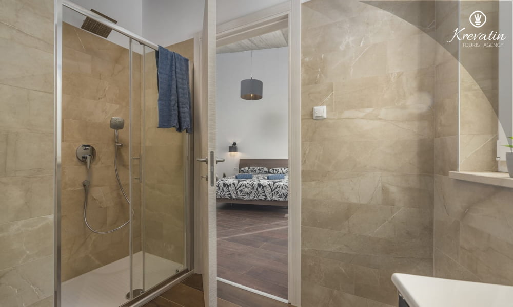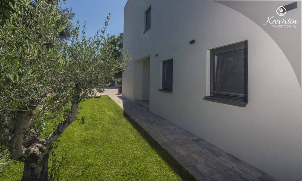 jedne spavaće sobe, druga ima tuš i wc. Treća kupaonica opremljena je samo s wc-om i nalazi se u prizemlju. Vila ima prostranu terasu s roštiljem, lijep vrt i privatni bazen. Privatni parking, SAT-TV, klima, perilica rublja, perilica posuđa, internet i bazen su uključeni u cijenu. Kućni ljubimci su dobrodošli uz nadoplatu.